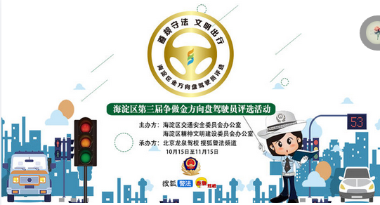海淀区交通安全委员会办公室、海淀区精神文明建设委员会办公室联合北京龙泉驾校与搜狐警法频道共同开展第三届“遵规守法 文明出行”争做金方向盘驾驶员评选活动。邀请广大机动车主积极参与,只要您驾驶的车辆在活动期间无任何交通违法记录即可获得评选资格。