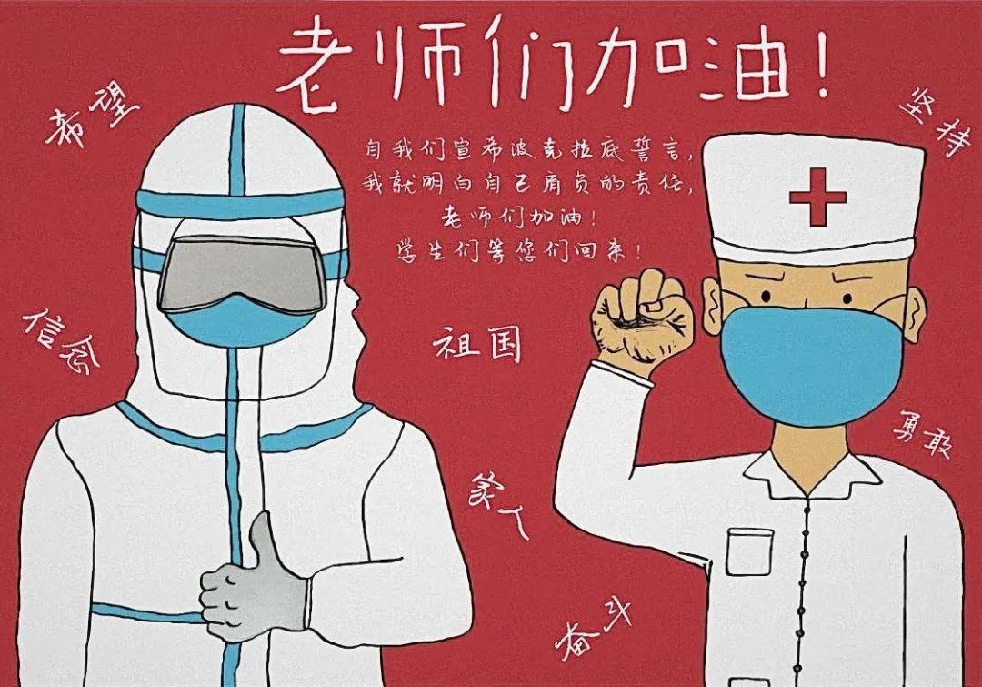 在别人眼中是伟大的医护工作者,在我们的眼中,他们是良师,益友,亲近的大哥哥大姐姐,是教给我们知识和道理的人,他们在我们人生转折点起着不可或缺的作用,我能做的不多,我希望让他们知道,别担心,别害怕,我们在后面一直为你们加油,我们一直相信你们。这幅画我画了好几天,我没有电子笔只能用手去在平板上慢慢上色,填字,每一笔我都为我们敬爱的老师们而画,我期盼着这些我敬爱的老师们,从事我热爱的医护工作的,甘于奉献敢于担当的勇士们,平安归来!