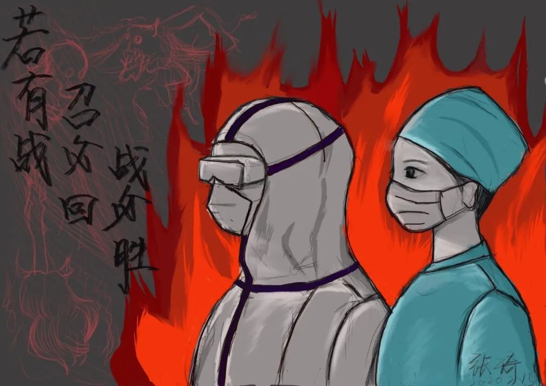 以小汤山医护人员请战书为素材,用procreate完成了这张简陋的画。火焰代表我们的意志同时也代表疫情刻不容缓,右边字下的妖魔鬼怪用铅笔画出,代表我们必将战胜病魔。