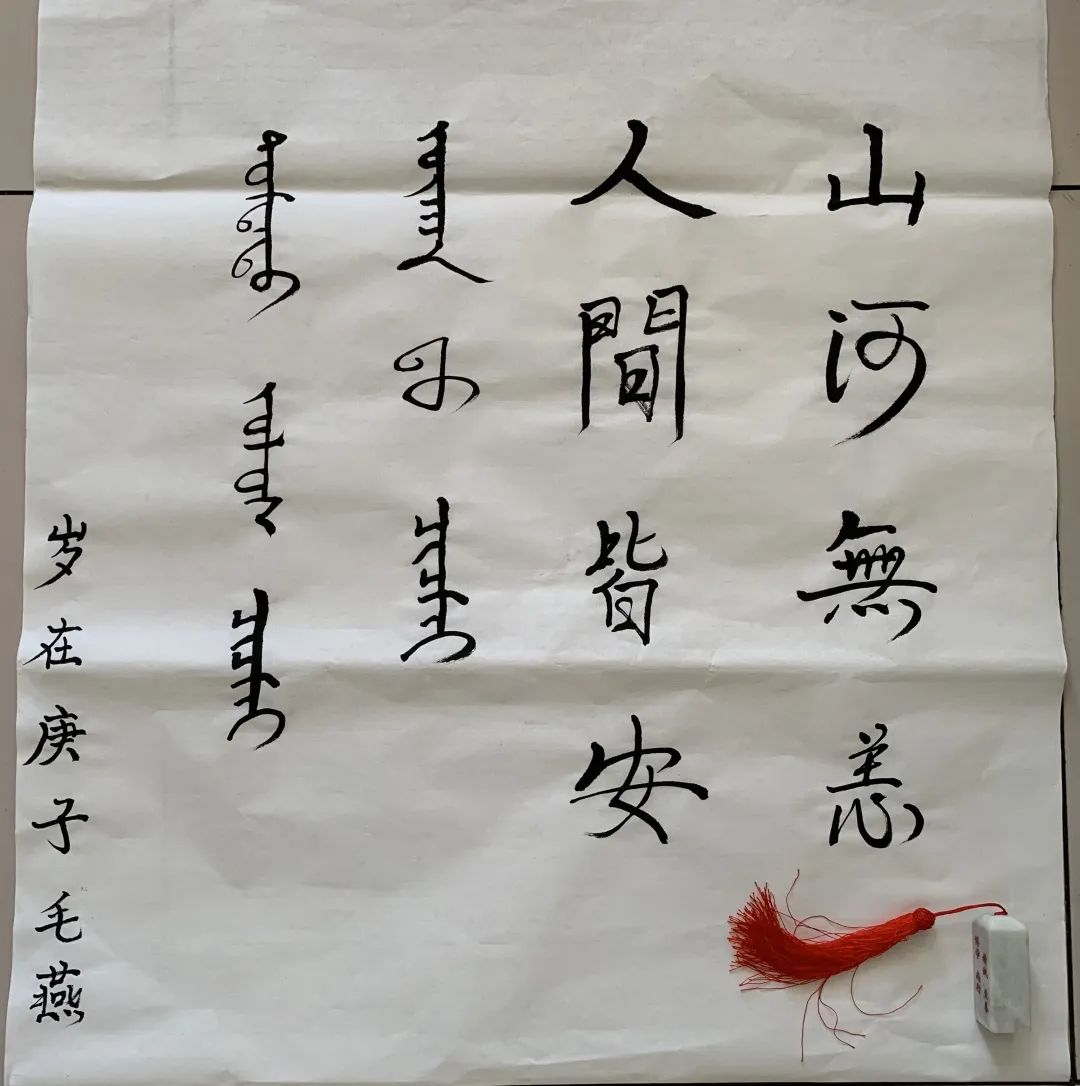 突如其来的疫情并没有打倒顽强勇敢的中华儿女,全国人民众志成城共抗疫情。致敬逆行中的白衣天使,心系祖国每一寸土地。望庚子初春,国泰安康。正文内容为“山河无恙,人间皆安,武汉加油,中国加油(后两者为传统蒙语版)”