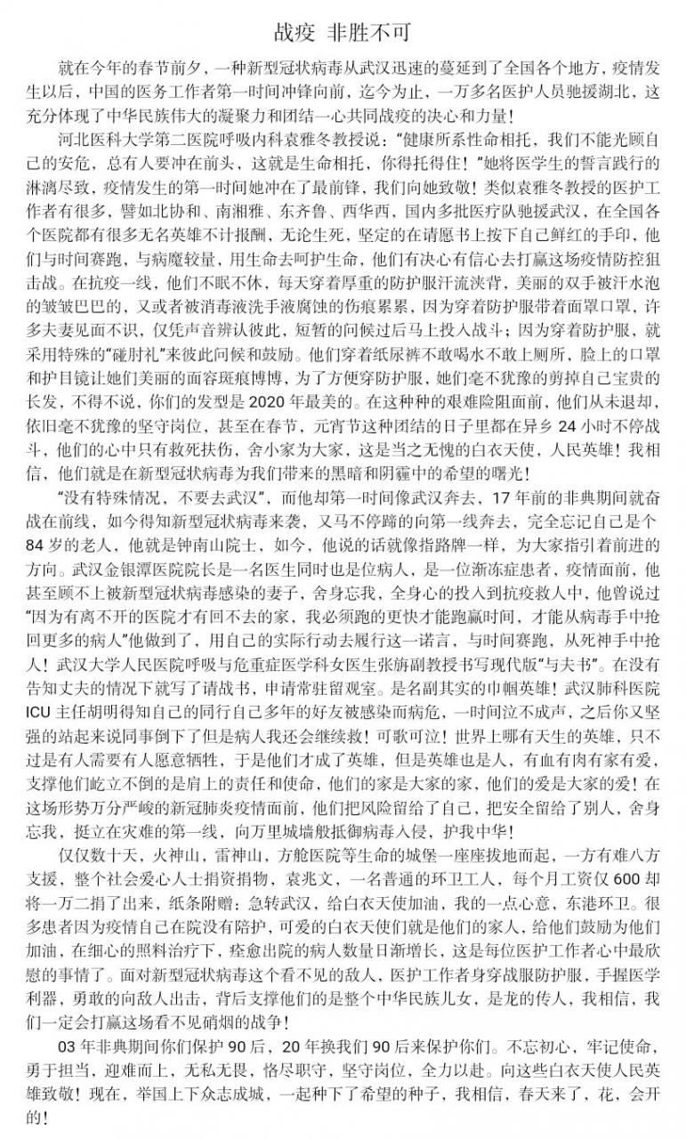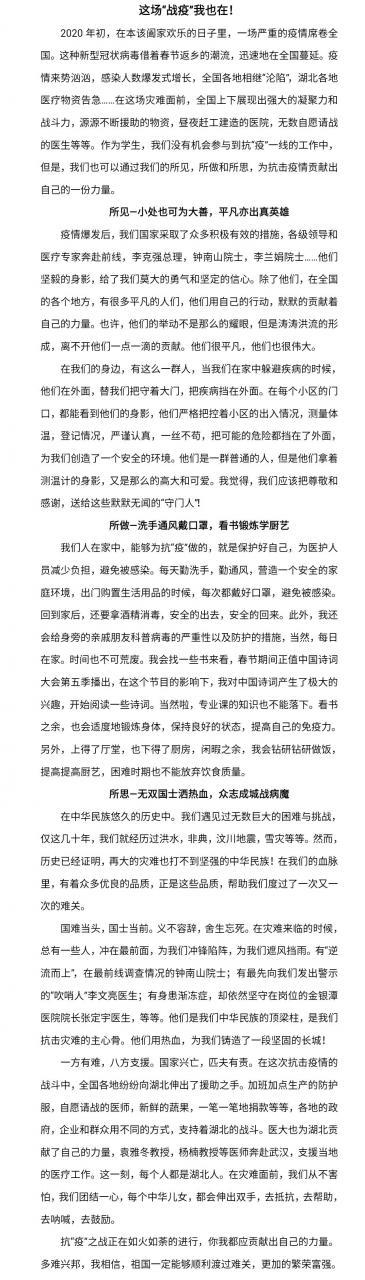 我们现在还是医学生,没有能力到前线治病救人,但是我们仍可以尽自己的一份力,在家里积极宣传、认真学习、保持健康心态,努力提升自己、掌握技能。相信未来的我们一定会成为优秀的医生!少年们 加油吧!