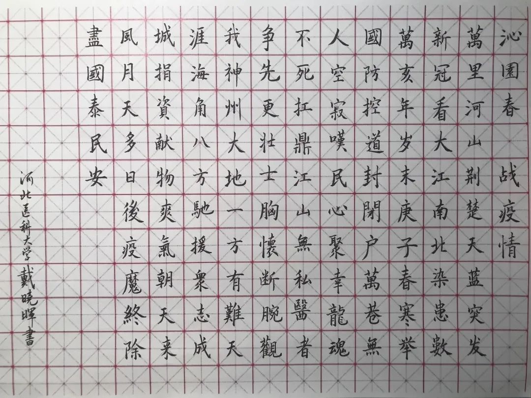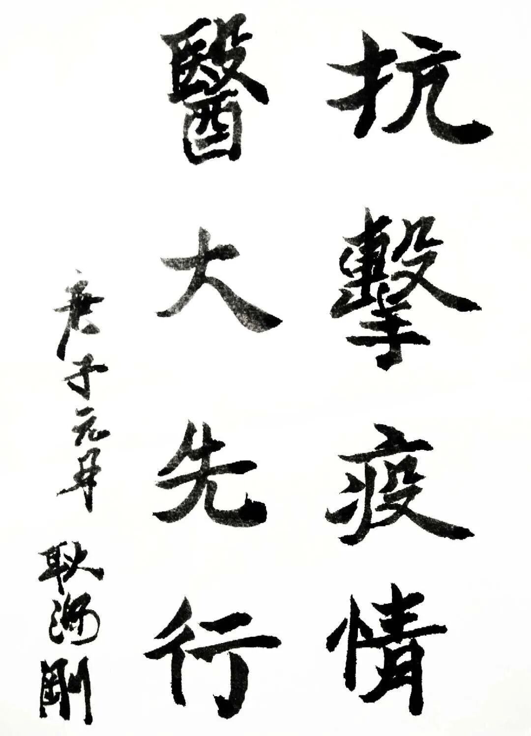 武汉疫情爆发之后,我看到了医院的老师们披挂上阵,奔赴战场;看到了学校在对抗疫情方面做出的一系列举措;看到了全校师生对疫情的关注和为抗击疫情做出的不懈努力。面对这场没有硝烟的战争,河北医大人永远是奋战在一线的先行者!这幅书法作品献给全体医大的同胞!
