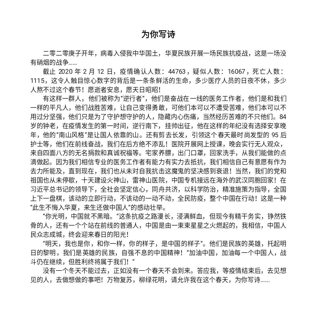 我们现在还是医学生,没有能力到前线治病救人,但是我们仍可以尽自己的一份力,在家里积极宣传、认真学习、保持健康心态,努力提升自己、掌握技能。相信未来的我们一定会成为优秀的医生!少年们 加油吧!