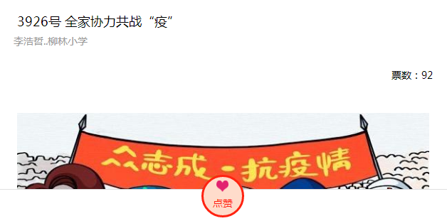 打开评选大赛链接,找到对应选手比如 3926号 全家协力共战“疫” ,然后点击点赞按钮,就会投票成功。