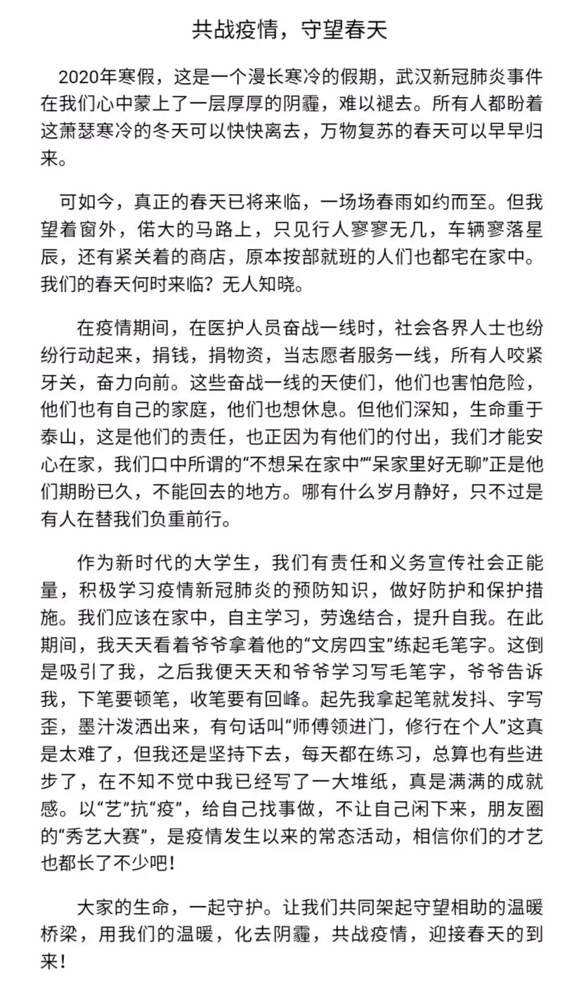 防疫情,不添乱。在家,我们一样很棒。在疫情中人们尽量减少了聚集和出行,不少“文艺工作者”把微信朋友圈变成“艺术展厅”。以居家防疫、防诈骗等与相关疫情为内容,以书画、歌声、视频、朗诵、写信等形式进行创作。