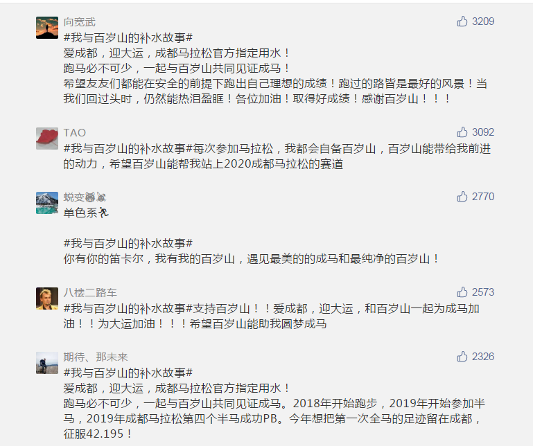 方式一:以#我与百岁山的补水故事#话题在本文评论留言,点赞数前15名,赠送成都马拉松参赛名额。(活动截止时间:2020年11年13日15点)