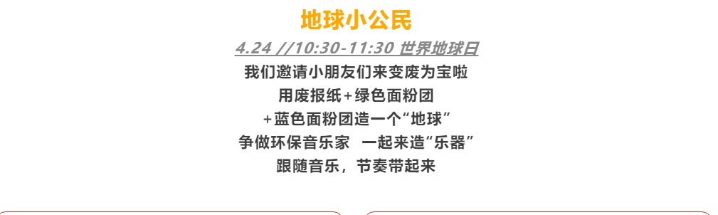 活动介绍:我们邀请小朋友们来变废为宝啦用废报纸+绿色面粉团+蓝色面粉团造一个“地球”争做环保音乐家 一起来造“乐器”跟随音乐,节奏带起来,邀请20组小朋友来参加恐龙纸板箱拼搭,一只只纸箱变身小恐龙,再来一场欢快的巡游吧。