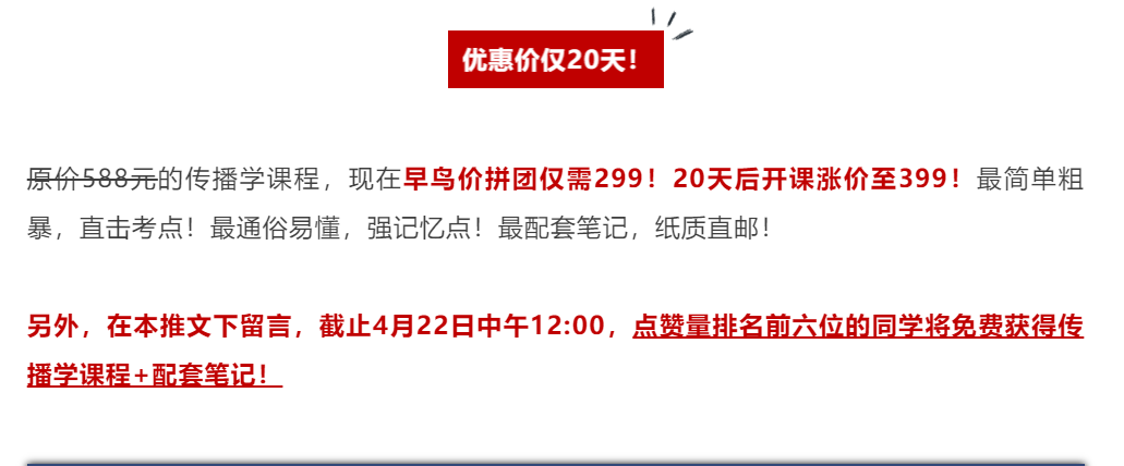 在本推文下留言,截止4月22日中午12:00,点赞量排名前六位的同学将免费获得传播学课程+配套笔记!