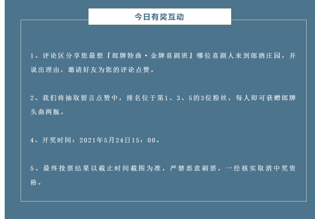 1、评论区分享您最想『郎牌特曲·金牌喜剧班』哪位喜剧人来到郎酒庄园,并说出理由,邀请好友为您的评论点赞。