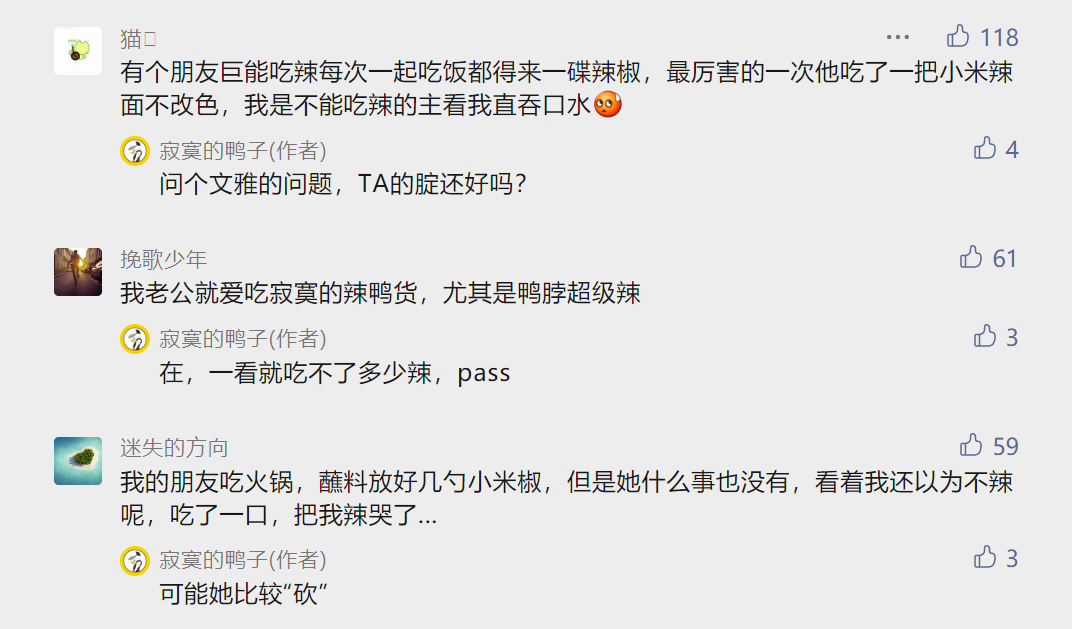 有个朋友巨能吃辣每次一起吃饭都得来一碟辣椒,最厉害的一次他吃了一把小米辣面不改色,我是不能吃辣的主看我直吞口水