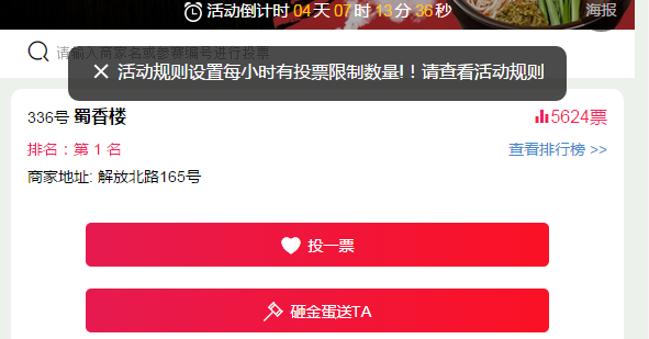 3、本次活动严禁任何形式的刷票;当票数增长异常,如每小时投票超过300票(不包含砸金蛋票数),系统会自动拦截或屏蔽。