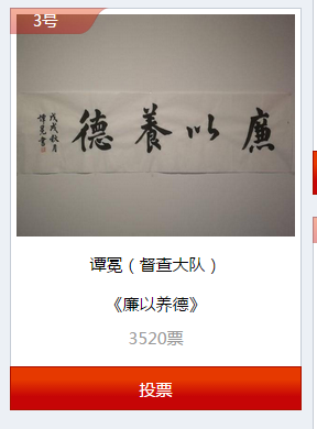 为深入贯彻落实党的十九大精神和上级纪委监委关于反腐倡廉的一系列决策要求,进一步推动廉政文化建设,增强我局工作人员的廉洁自律意识和法纪观念。根据我局《2018年党风廉政建设主体责任及任务分解》文件关于重点开展“五个一”教育警示活动的安排部署,经局党委研究,决定组织我局全体工作人员及家属(包含父母、配偶、子女)开展“崇廉杯”廉政书法、绘画、摄影比赛。目前,参赛作品已报送完毕,欢迎大家为自己支持的作品投票,选出您心目中的优秀廉政书法、绘画、摄影作品。