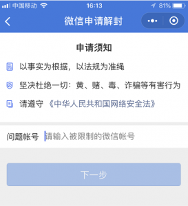 3.点击微信申请解封,输入受限微信号信息,点击下一步。