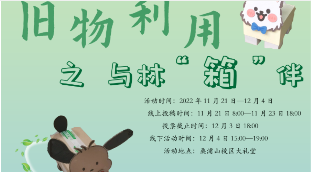 Part.01 线上活动投票 与林“箱”伴活动一经推出, 就收到了大家的支持和好评! 我们陆续收到了, 各种各样有趣的作品, 让我们为喜欢的作品投票吧! 作品展示 1号作品 20生物技术叶李佳 左右滑动查看更多 2号作品 22广告学 叶于霖 郑丹丹...