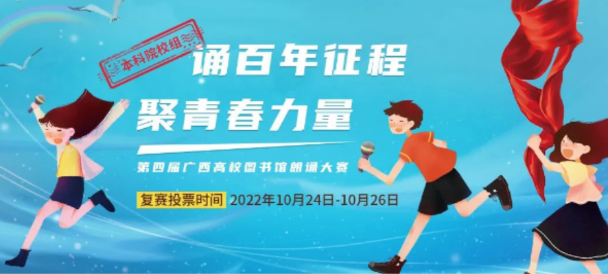 第四届广西高校图书馆“诵百年征程 聚青春力量”朗诵大赛经过初赛校内选拔后,我校共选送15个作品,所有复赛作品目前已集结完毕。欢迎广大师生为你喜爱的好声音、好作品投上宝贵的一票!前期投票清零,正式投票从10月24日开始计算。 诵百年征程 聚青春力量 投...