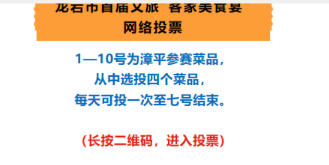 龙岩市首届文旅“客家美食宴” 网络投票 1—10号为漳平参赛菜品, 从中选投四个菜品, 每天可投一次至七号结束。 (长按二维码,进入投票) 转起来!每天都投票哦! 我们漳平的票数,怎能低于其他县,对吧! 转载请注明:微信点赞 » 「一季一...
